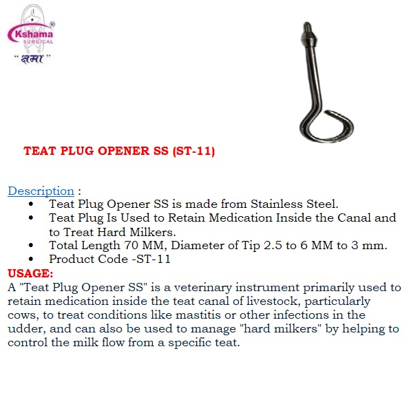 A “Teat Plug Plug Opener” is a veterinary instrument primarily used to retain medication inside the teat canal of livestock, particularly cows, to treat conditions like mastitis or other infections in the udder, and can also be used to manage “hard milkers” by helping to control the milk flow from a specific teat.